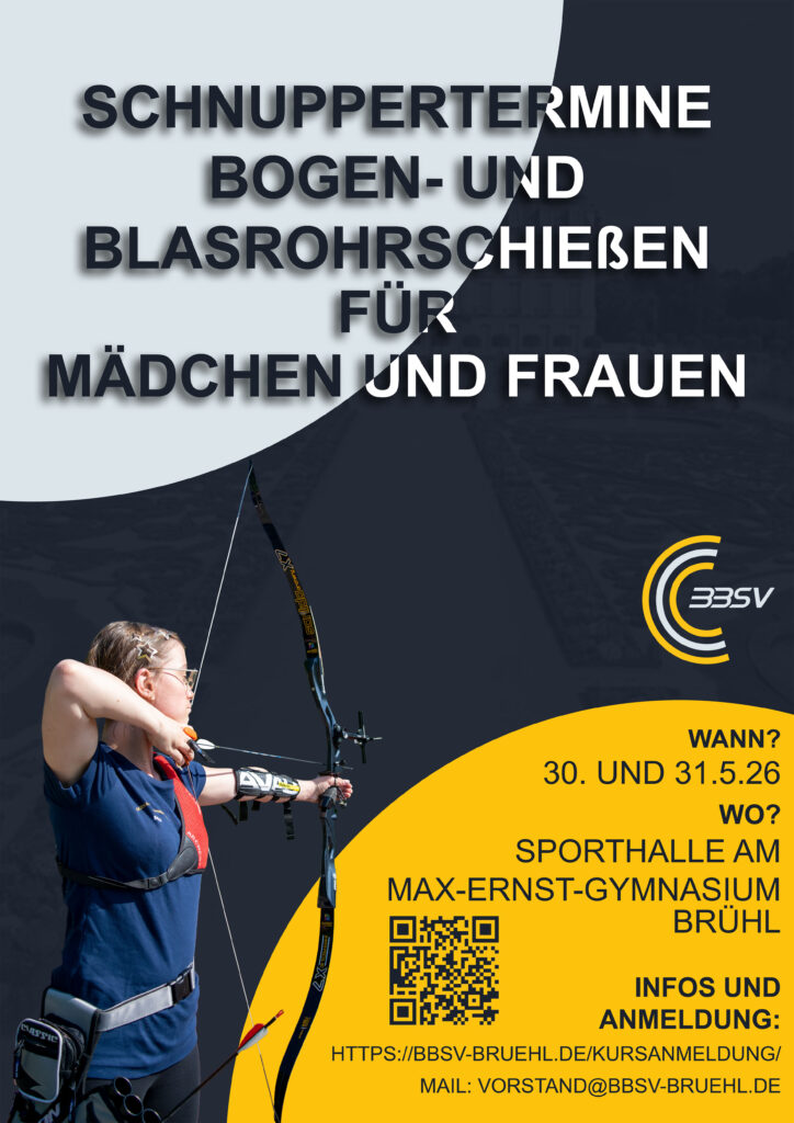 Der BSV Brühl e.V. lädt alle interessierten Mädchen und Frauen herzlich ein, den Bogen- und Blasrohrsport bei unseren Schnupperterminen kennenzulernen. An zwei Tagen bieten wir insgesamt drei Einheiten mit jeweils etwa 2,5 Stunden Dauer an, in denen Einsteigerinnen die Möglichkeit haben, diese faszinierenden und vielseitigen Sportarten auszuprobieren.